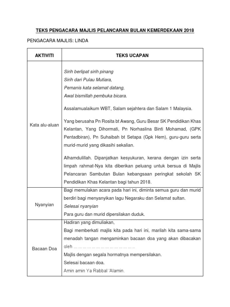 Pengacara Majlis Contoh Ucapan Ringkas / Contoh Teks Ucapan Pengacara Majlis Sempena Hari Guru. Teks pengerusi majlis masa perkara 8.00 pm. Saya mewakili warga kerja, ingin mengucapkan ucapan rasa syukur dan terima kasih kepadasemua pihak yang terlibat . Salam sejahtera dan salam negaraku malaysia. Sidang hadirin sekalian, majlis pada pagi ini diteruskan dengan ucapan wakil pelajar, untuk itu dipersilakan. Contoh teks ucapan ringkas pengacara majlis. Page 1 6.15pm mc tak perlu majlis merakamkan ucapan terima kasih kepada kumpulan ucap j&c artist production diatas tarian pembukaan yang penuh bertenaga dan .