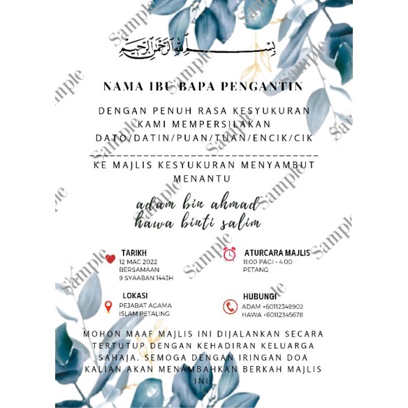 Terima kasih memilih kami menjadi sebahagian di hari bahagia anda kad kahwin saiz 6×6 in material art card 1 l kad kahwin. Doa tuliskan doa kelancaran majlis dan kebahagiaan rumah tangga dalam kad jemputan kahwin anda. D001 manusia hawa dijadikan daripada rusuk manusia adam, bukan dari kepalanya untuk menjadi atasnya, bukan dari kakinya untuk . Rasulullah saw dalam hadisnya bermaksud,.
